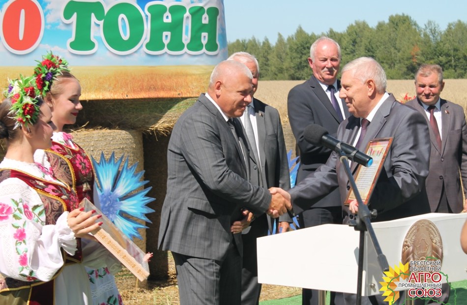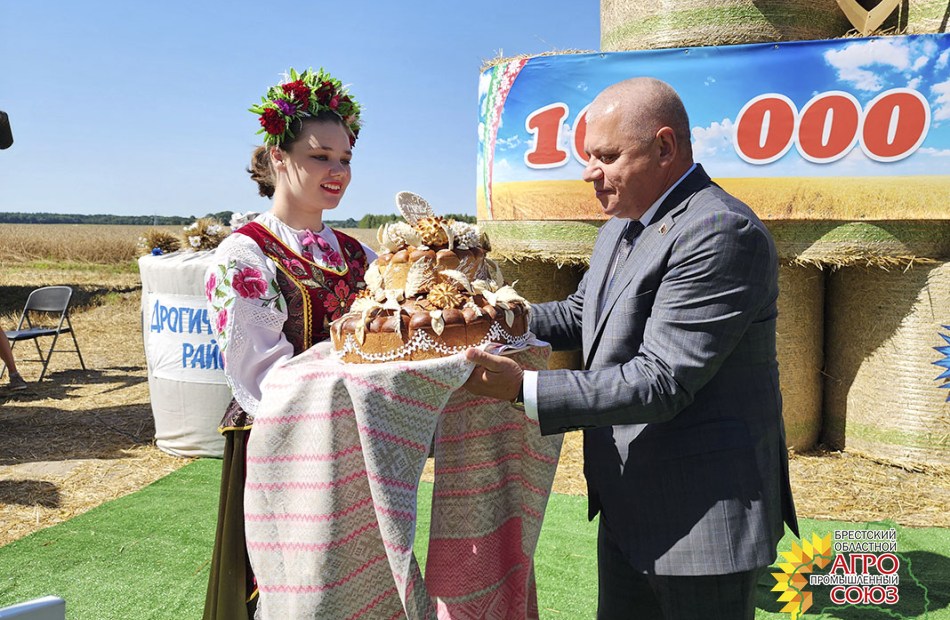 Сергей Дмитриевич вручил председателю Дрогичинского райисполкома Сергею Николаевичу Пачко Благодарственное письмо с поздравлением в адрес аграриев региона, а также специально испеченный к этому событию символичный каравай со словами «Гордимся хлеборобами Дрогичинского района за достижение рубежа в 100 000 тонн зерна»