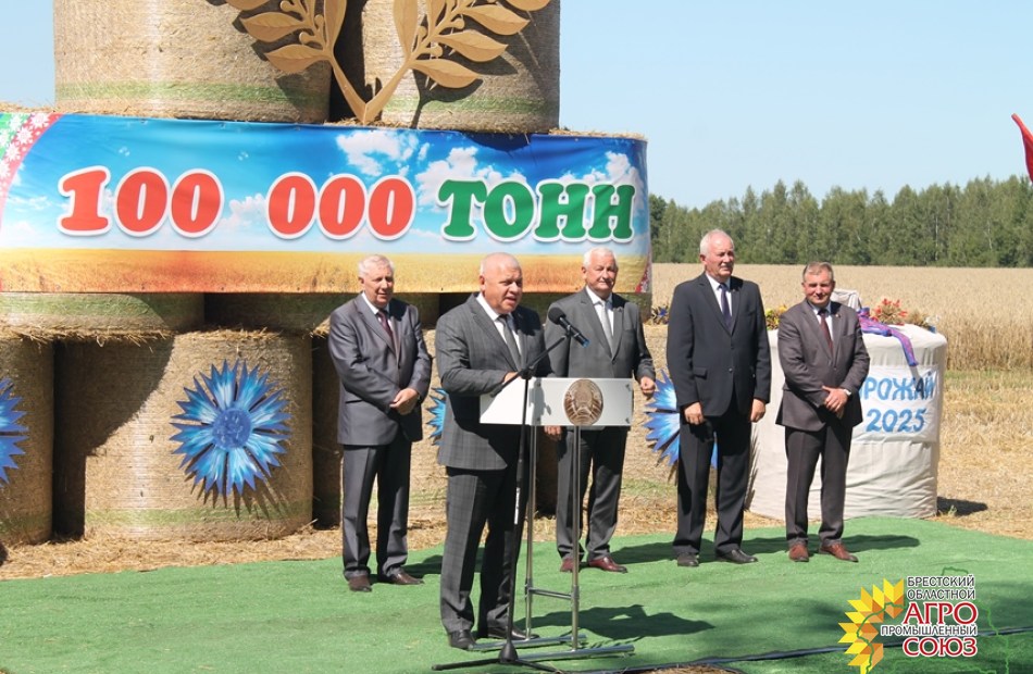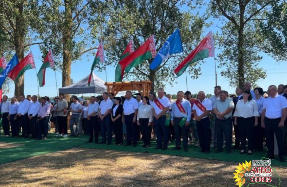 Чествование героев жатвы по доброй традиции прошло на пшеничном поле одного из ведущих хозяйств региона – ОАО «Алексеевичи-Агро». Это событие стало настоящим праздником труда и признания заслуг тех, кто ежедневно работает на земле, обеспечивая продовольственную безопасность региона и всей страны. Поздравить хлеборобов, поблагодарить их за самоотверженный труд, за существенный вклад в каравай Брестчины – 2025 приехали почетные гости - председатель Брестского областного исполнительного комитета Петр Александрович Пархомчик, председатель Дрогичинского райисполкома – Сергей Никеолаевич Пачко, его первый заместитель, начальник управления по сельскому хозяйству и продовольствию Сергей Сергеевич Глинский, исполнительный директор Брестского областного агропромышленного союза Сергей Дмитриевич Ашмянцев, председатель Брестской областной профсоюзной организации работников АПК Александр Павлович Солоневич.